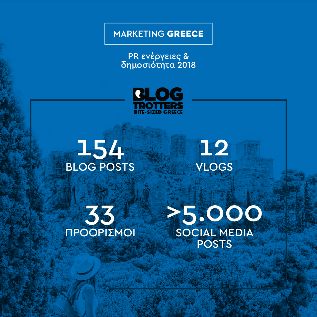 Παράλληλα, η ψηφιακή πλατφόρμα προώθησης storytelling ταξιδιωτικών εμπειριών για διεθνείς digital influencers, Blogtrotters, ανέδειξε την ελληνική γαστρονομία. Με concept “BiteSized Greece, digital influencers ταξίδεψαν σε όλη την Ελλάδα με σκοπό να ανακαλύψουν τους προορισμούς μέσα από τα τοπικά προϊόντα αλλά και τα τοπικά προϊόντα μέσα από τους προορισμούς. To αποτέλεσμα της ενέργειας αποτυπώθηκε σε 154 blog posts, 12 vlogs και περισσότερα από 5.000 social media posts που ταξίδεψαν το διεθνές ταξιδιωτικό κοινό σε 33 προορισμούς.
