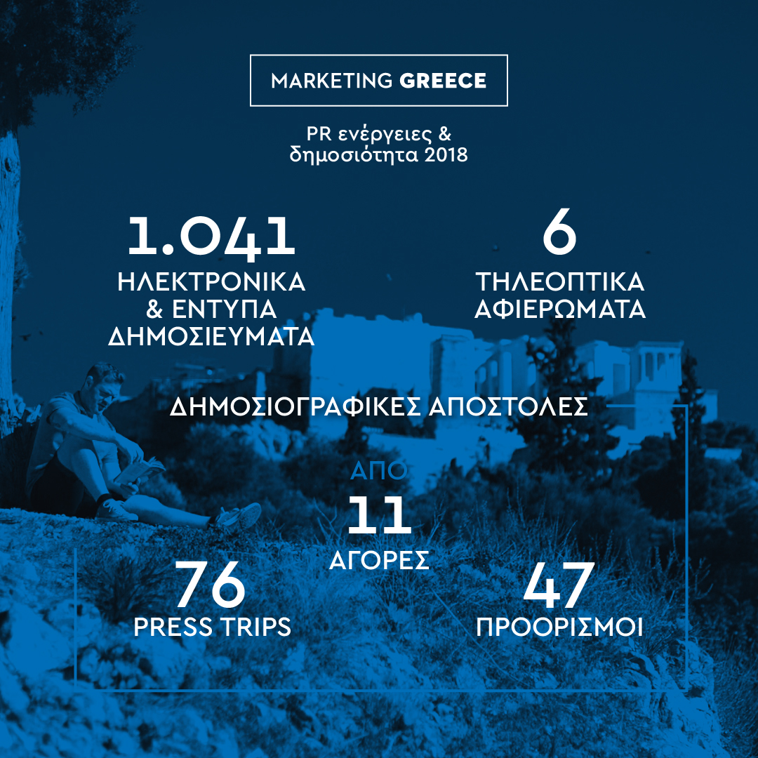 Μέσα από ένα στοχευμένο πρόγραμμα δημοσιότητας, εναρμονισμένο με τις marketing προτεραιότητες της εταιρείας, η Marketing Greece ανέδειξε ελληνικούς προορισμούς και αυθεντικές ταξιδιωτικές εμπειρίες μέσα από ένα πλήθος αφιερωμάτων σε διεθνή ΜΜΕ. Συνολικά προέκυψαν 1,041 δημοσιεύματα σε ηλεκτρονικά και έντυπα μέσα καθώς και 6 τηλεοπτικά αφιερώματα. Δημοσιογραφικές αποστολές από 11 αγορές συμμετείχαν σε 76 press trips και επισκέφθηκαν 47 προορισμούς της Ελλάδας.